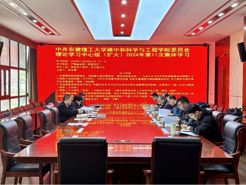 2024 年 11 月 28 日,碳中和科学与工程学院党委理论学习中心组(扩大)在产教融合楼一楼会议室举行第11次集体学习会议。会议由学院党委书记徐良骥主持,校第十二检查组成员列席会议,学院党委理论学习中心组成员及各党支部书记参会。