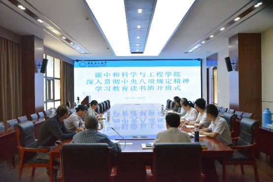 2025年4月10日上午,碳中和科学与工程学院党委在产教融合楼一楼会议室举行深入贯彻中央八项规定精神学习教育读书班开班式暨党委理论学习中心组学习(扩大)会议。学院党委领导班子、党支部书记、各系部及部门负责人参加会议,院党委书记武成利主持会议并作读书班开班讲话。