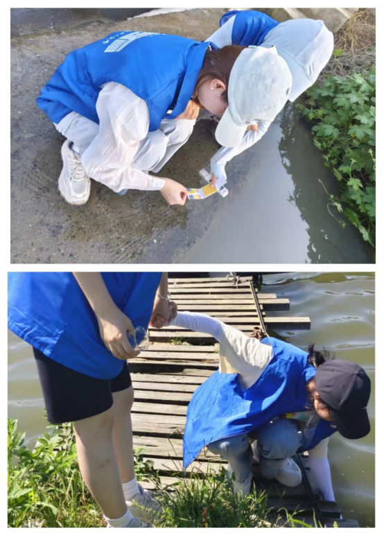 7月1日清晨,团队成员携带专业水质检测设备深入板桥河监测点,通过水质检测笔、便携式PH试纸等工具,对河道不同区段开展系统化采样检测。队员们手持水质检测笔,像把脉一样测量着河流的“健康指标”。“pH值7.8,溶解氧5.6mg/L……”队长周瑞京一边记录,一边解释:这些数据就像河流的体检报告。同时,团队成员深入梁园镇,在梁园镇金湾养殖场同步进行水质调研。
