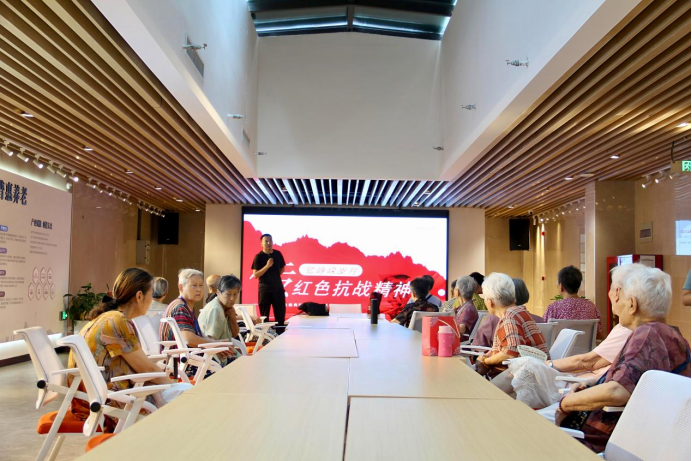 邓礼瑞老师以"永不褪色的红色记忆"为主题,通过珍贵的历史影像和生动的革命故事,系统梳理了中国共产党人的精神谱系。宣讲特别聚焦长征精神、抗战精神等革命精神内涵,为现场营造了浓厚的红色文化氛围。智慧养老中心活动接洽相关负责人连主任表示:“这样的红色教育活动既丰富了老人们的精神生活,也让年轻一代接受了生动的革命传统教育。”智慧养老中心有着从军经历的奶奶们也深有感触,纷纷与志愿者们分享了自己入伍的经历,尤其是说到抗美援朝时,泪眼婆娑,感人肺腑。团队成员学生代表张同学不禁感慨道,“听到这些真实的历史故事,我们更加懂得了今天幸福生活的来之不易。"