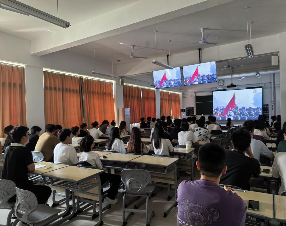 观看过程中,学生们全神贯注聆听习近平总书记在纪念大会上的重要讲话,通过回溯抗战历史、缅怀革命先烈,进一步强化了历史责任感和民族使命感。当受阅方队以铿锵步伐、严整军容和尖端装备震撼亮相时,现场学生无不心潮澎湃。这场展现国家国防实力与捍卫和平决心的视觉盛宴,让同学们深刻体会到“强国必须强军”的深刻内涵,爱国主义教育在沉浸式体验中入脑入心。