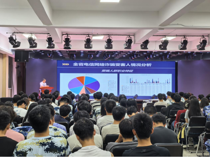 讲座开篇,王如文指出,新生社会经验相对不足,是电信网络诈骗高风险人群,强调识诈防骗是大学生活的“必修课”,关乎校园生活安全稳定。随后,他从三个方面展开讲解:揭秘电信诈骗,认清犯罪本质,电诈具有“远程、非接触、隐蔽性强”的特点,他列举了近期在大学生中发生的真实案例,让同学们直观认识到诈骗的形式和危害,打破“诈骗离自己远”的误区;剖析常见类型,提升防范意识,针对大学生习惯,他重点梳理刷单返利、冒充客服、网络交友三类诈骗,并强调诈骗以“轻松赚钱”为诱饵,借“订单异常”行骗,提醒新生时刻警惕;分析受害人群,筑牢心理防线,他指出诈骗分子利用大学生单纯、贪利等心理作案,建议大家树立正确价值观,对陌生信息“不轻信、不转账、不透露敏感信息”。
