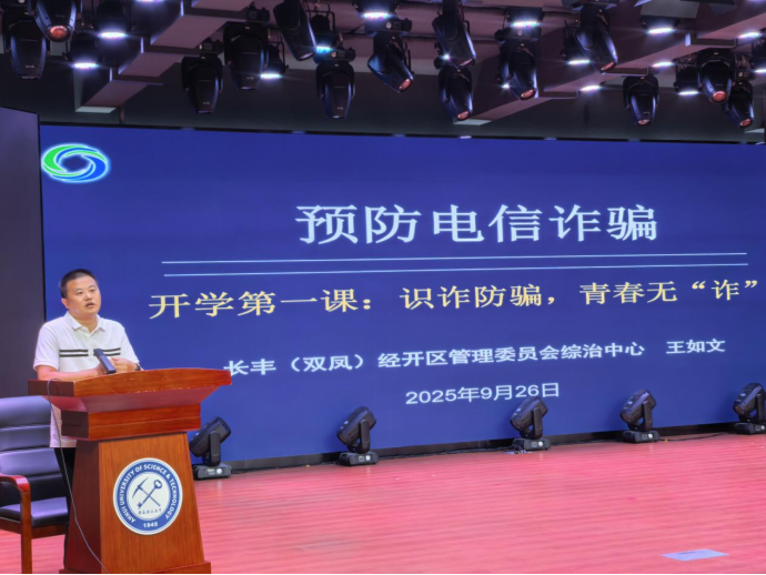 9月26日晚,碳中和科学与工程学院2025级新生启航教育系列活动,在知辛楼三楼活动中心举办。此次活动以“识诈防骗,青春无诈”为主题,特邀长丰(双凤)经开区管委会综治中心王如文处长主讲,为新生带来实用的防诈骗安全教育讲座。