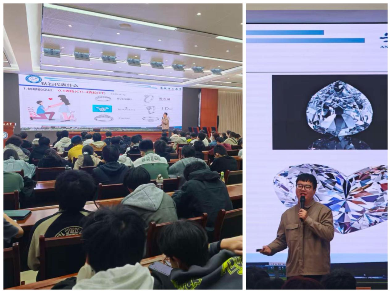 讲座伊始,耿传文老师为同学们生动讲述“材料届的‘皇冠’——钻石”,耿老师通过多张亮晶晶的钻石图片引入话题,讲述了钻石的实际应用和现代合成工艺,让同学们对钻石的来源有了更深入的了解。