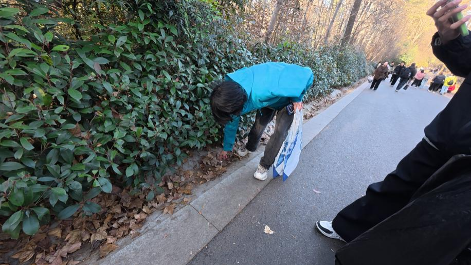 虽是冬日,梅冲湖畔仍有草木的余温,湖面的风裹着浅淡的水汽,却丝毫没有影响同学们的热情。大家三两结伴,沿着湖岸的步道徒步前行,目光仔细地扫过草坪、石缝、长椅周边的每一个角落,将隐藏在草丛中的塑料瓶、被风吹落的食品包装袋、遗落在石滩上的烟蒂等垃圾一一捡起,放进随身的垃圾袋中。过程中,不少同学还主动交流起日常学习到的环保知识,比如不同材质垃圾的分类方式,微小塑料对水体生态的影响,还有同学分享了自己了解到的碳中和相关实践案例,让一场简单的捡垃圾活动,变成了专业知识的交流课堂。