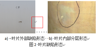 选一地面放置叶片,叶片存在梁帽褶皱缺陷(叶片内外部缺陷如图2所示),通过现场勘察,缺陷为贯穿状态,在叶片的内表面有布层的发白现象。使用红外相机按不同距离对缺陷进行拍摄,观察不同距离对拍摄效果的影响。