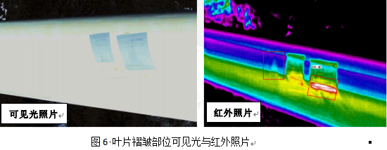 项目对野外缺陷叶片开展了有针对性的检测研究。通过无人机搭载可见光/红外光双光镜头进行数据采集。通过无人机巡检过程中拍摄到一处叶片修补后的图像6可以明确测得叶片维修后叶片不连续和积胶情况。