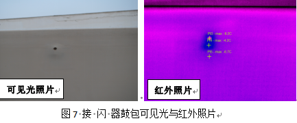 通过无人机巡检过程中拍摄到一处接闪器鼓包位置,可见光照片及红外照片如图7 所示: