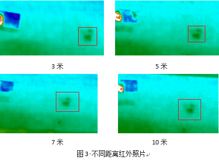 将红外相机对叶片按3米、5米、7米、10米距离分别进行拍摄,得到红外照片如图3所示: