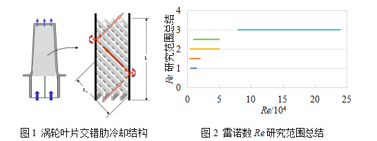 交错肋这种冷却结构,通过肋片顶面相互接触,形成多个曲折子通道(如图1所示),在涡轮叶片冷却和结构强度方面均有较大优势。结合文献调研(如图2所示),当进口雷诺数处于104量级时,交错肋换热特性不同。而且肋倾角的变化范围较窄,且研究范围不集中,整体上导致肋倾角对交错肋换热效果的影响较不清晰。所以有必要研究进口雷诺数在104量级,且肋倾角范围较广的交错肋换热特性。