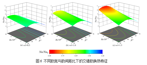 交错肋的平均努塞尔数受肋倾角的影响最明显。当肋宽与肋间距比较大时,进口雷诺数对平均努塞尔数的影响效果更加明显,同时,随着进口雷诺数的增大,平均努塞尔数对肋宽与肋间距比的敏感性也增强。