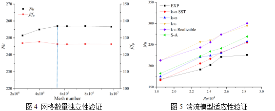 利用ICEM CFD软件进行结构化网格划分,对所有壁面网格进行加密,保证y+趋于1,膨胀比为1.2,以543万为计算模型网格数量的划分标准(如图4所示)。基于Fluent进行数值模拟。选泽k-ω SST为湍流计算模型(如图5所示)。冷却工质选为理想气体,进口雷诺数折算为进口质量流量,湍流度为5%,进口温度300 K,给定出口压力101.325 kPa,交错肋壁面恒定温度330 K,进出口延长段均为绝热壁面。