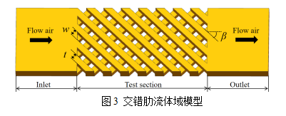 研究者借助响应曲面法进行试验设计和数据分析,对交错肋换热特性进行数值模拟研究,重点分析进口雷诺数(Re)在2×104~105、肋倾角(β)在20°~70°以及肋宽与肋间距比(t/w)为0.5~1.5时,交错肋的换热特性,确定各参数对交错肋平均努塞尔数、流阻系数和综合流动传热性能的影响规律。最终建立某型燃气轮机涡轮叶片交错肋结构的预测模型。