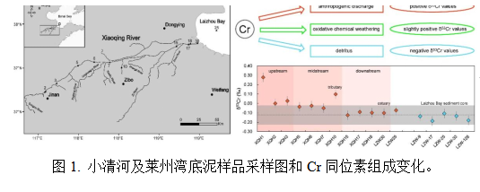 Cr(VI)是一种常见的重金属污染物,水体中的Cr污染主要来源于采矿、皮革制造、电镀等行业。水污染严重地区的居民,经常接触或过量摄入Cr(VI),会刺激皮肤和呼吸道,引起皮炎、鼻炎和支气管炎等疾病,还可能诱发鼻咽癌和肺癌。相对于Cr(VI)来说,Cr(III)毒性较低,且难溶于水。所以Cr污染治理的主要方法是将Cr(VI)还原为Cr(III)。常用的监测Cr(VI)还原的方法是长期测定不同地点的Cr(VI)浓度。但是,这种方法不能判断Cr(VI)浓度的减少是由于还原作用,还是稀释、对流或吸附等作用引起的。Cr同位素可以帮助专一地评估Cr(VI)的还原程度,受其他因素影响很小。我们以山东莱州湾入海河流中污染严重的小清河为研究对象,系统测定了从上游到河口底泥沉积物的Cr同位素组成。在小清河上游区域,底泥δ53Cr值偏正,可能指示来自工业生产Cr的输入;而中游区域底泥具有稍偏正的δ53Cr值,可能指示来自自然环境氧化风化的贡献;下游、河口以及莱州湾底泥的δ53Cr值均落在火成岩储库的范围内,指示该区域Cr的主要来源为碎屑物质(图1)。河流沉积物的Cr同位素组成可以帮助我们识别河流中的Cr来源。同时,根据瑞利分馏模型,我们可以得出河水中的Cr(VI)至少有31%到55%已经被还原成Cr(III)。相关工作已发表在环境类期刊《Environmental Pollution》上。
