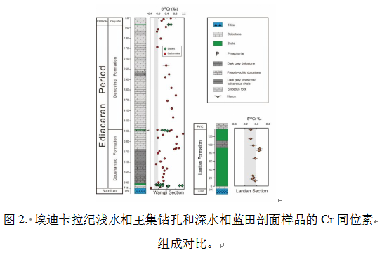 另外,由于氧化还原反应是导致Cr同位素分馏的主要因素,我们也可以利用Cr同位素示踪地质历史关键时期的大气和海洋氧化还原状态变化。埃迪卡拉纪(635 Ma ~ 541 Ma)是地质历史时期中的重要阶段,在此期间,宏体多细胞动物首次出现,而动物的生存需要环境中氧气含量达到一定的程度。但是,目前对于埃迪卡拉纪海洋氧化还原状态的演化历程仍存在争议。我们利用Cr同位素这一新兴的古环境氧化还原指标,分别测定了华南埃迪卡拉纪浅水相和深水相两套地质记录中的Cr同位素组成。结果表明,浅水相王集钻孔中的页岩具有较重的Cr同位素组成,而深水相蓝田剖面页岩的δ53Cr值则基本在火成岩储库的范围内(图2)。这说明埃迪卡拉纪海洋的氧化还原状态存在高度的空间不均一性,即浅水区域为氧化状态,而深水区域仍处于广泛厌氧状态。相关工作已发表在Nature Index期刊《Geochimica et Cosmochimica Acta》上。