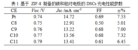为了研究煅烧温度对碳材料光电转换效率的影响,研究者测定了不同温度下制备碳材料的 J-V 曲线,如图4所示,对应的光电性能参数列于表1中。从表中可以看出,器件的短路电流密度(Jsc)随材料煅烧温度增加呈现先增后减的趋势。这是由于碳材料的石墨化程度随着煅烧温度增加而增大,提高了其导电性及催化活性。然而,当温度继续增加时,由于材料微观结构的坍塌以及粒子的团聚效应,导致衍生碳材料催化活性大大降低。同时,电解液中的 I3-/I-成分在衍生碳材料表面具有较小的还原过电势和较正的还原电势,因此基于衍生碳材料为对电极的电池开路电压(Voc)均高于基于铂电极的电池,且随煅烧温度的增加,趋势不断增大。最终,基于C10样品为对电极组装的电池得到了最高的光电转换效率(η)7.32%,与铂电极 7.53%的效率相当。