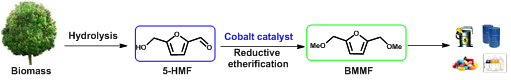 研究者针对温和条件下从HMF高收率获得新型柴油添加剂2,5-二甲氧甲基呋喃(BMMF)的难题,开发同时含有Co0物种和无定型Co3O4物种的双功能Co3O4催化剂,分别赋予催化剂加氢活性及醚化活性,最高得到98.5%的BMMF收率,从果糖出发,分两步实现66.5%的BMMF分离收率(图3)。