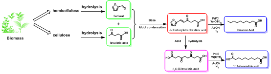 研究者针对中链脂肪酸难分离且奇数碳难制备的难题,开发兼具加氢活性和适宜Lewis酸酸性的Pd/C+W(OTf)6催化体系,其中W(OTf)6具有选择性切断呋喃环C-O键、内酯环C-O键及羟基C-O键而保留羧基氧的能力(图4)。以癸酸制备为模型反应最高得到94%的癸酸收率,同时以88%、85%和90%的收率分别实现了癸二酸、正庚酸和十一碳酸的高选择性制备。