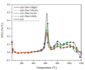 图1. nAl及其掺混不同添加剂混合样品的DTG曲线