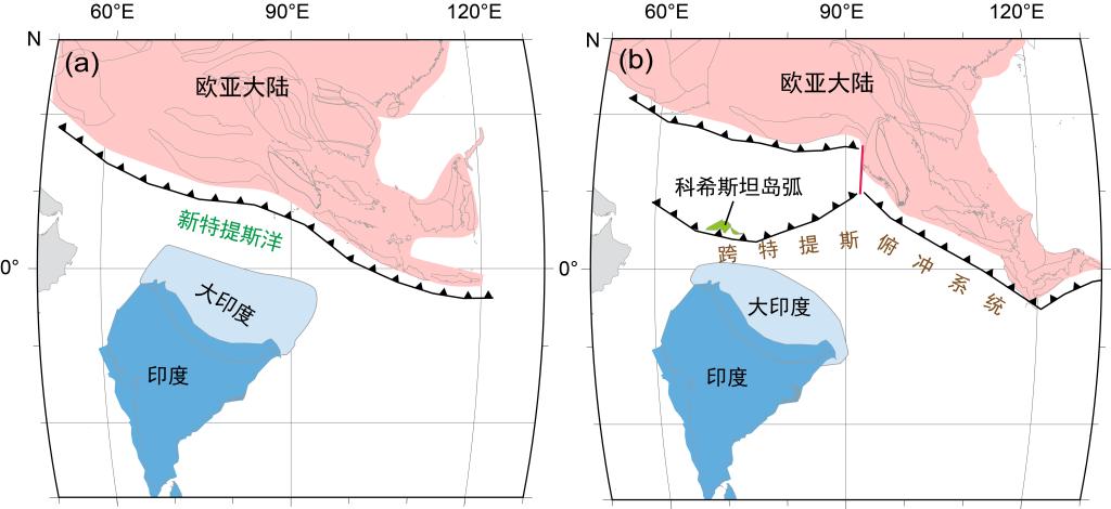 新特提斯洋闭合诱发的印度-欧亚大陆碰撞是新生代全球最为壮观的构造事件之一,不仅形成了雄伟的喜马拉雅山脉和广袤的青藏高原,也影响了全球气候和生态环境。然而,对于新特提斯的俯冲模式存在着强烈争议,人们已经建立了两种不同的模式:单俯冲vs.双俯冲(图1)。单俯冲模式提出印度大陆是在新特提斯洋持续俯冲下汇聚于亚洲南缘;而双俯冲模式则认为新特提斯洋在白垩纪期间还存在洋内俯冲系统,同时期两条俯冲带同向俯冲,促使印度大陆与欧亚大陆快速聚合。
