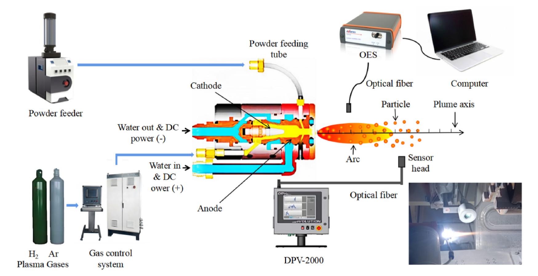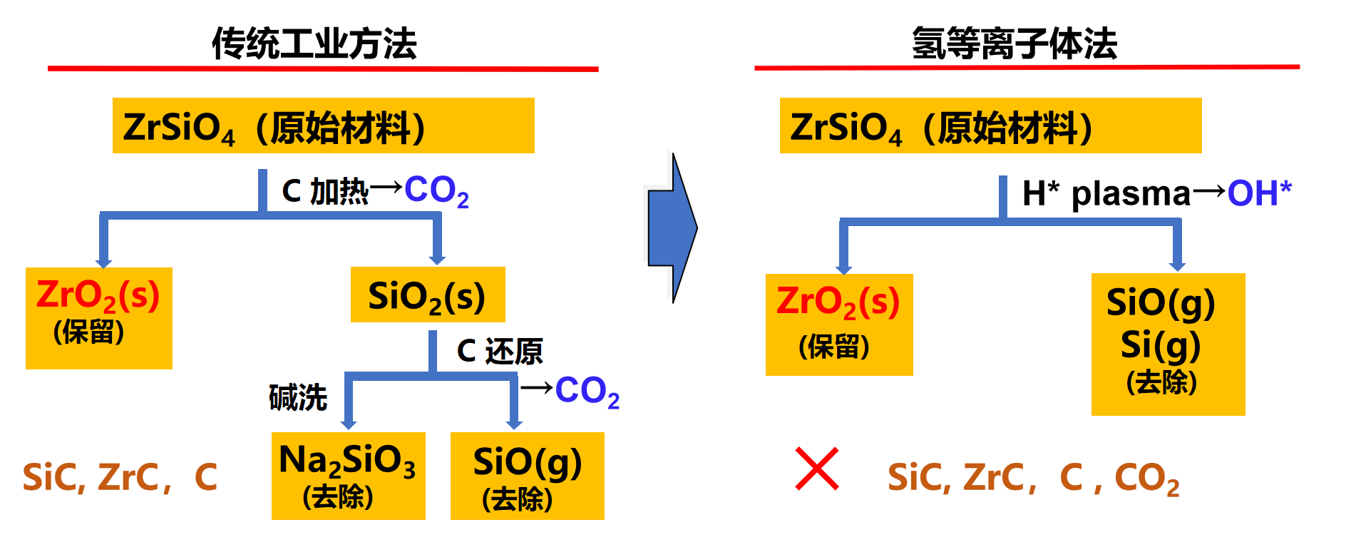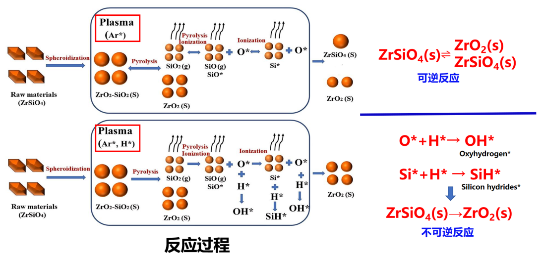 本研究特色在工作气体中加入H2对所得ZrO2纯度的影响。通过增加工作气体中H2的比例,利用等离子体光谱诊断和测量等离子体火焰中飞行粒子的粒径和温度,研究了H等离子体与ZrSiO4热解反应的相互作用及其对ZrO2纯度的影响。