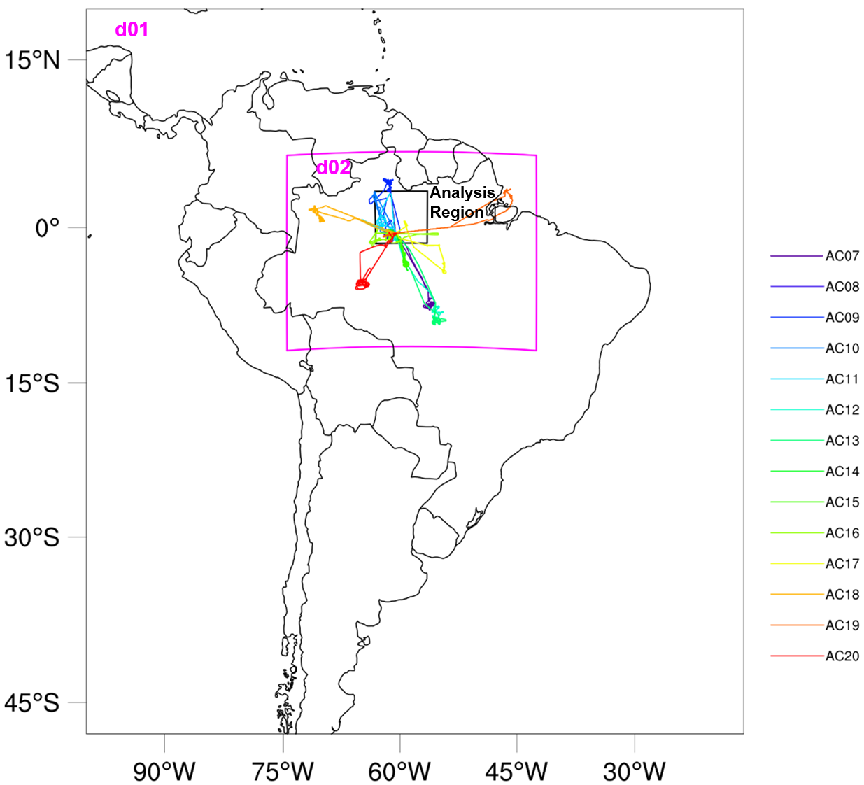 图1. 数值模拟区域设置及ACRIDICON-CHUVA 观测试验飞机航线分布。
