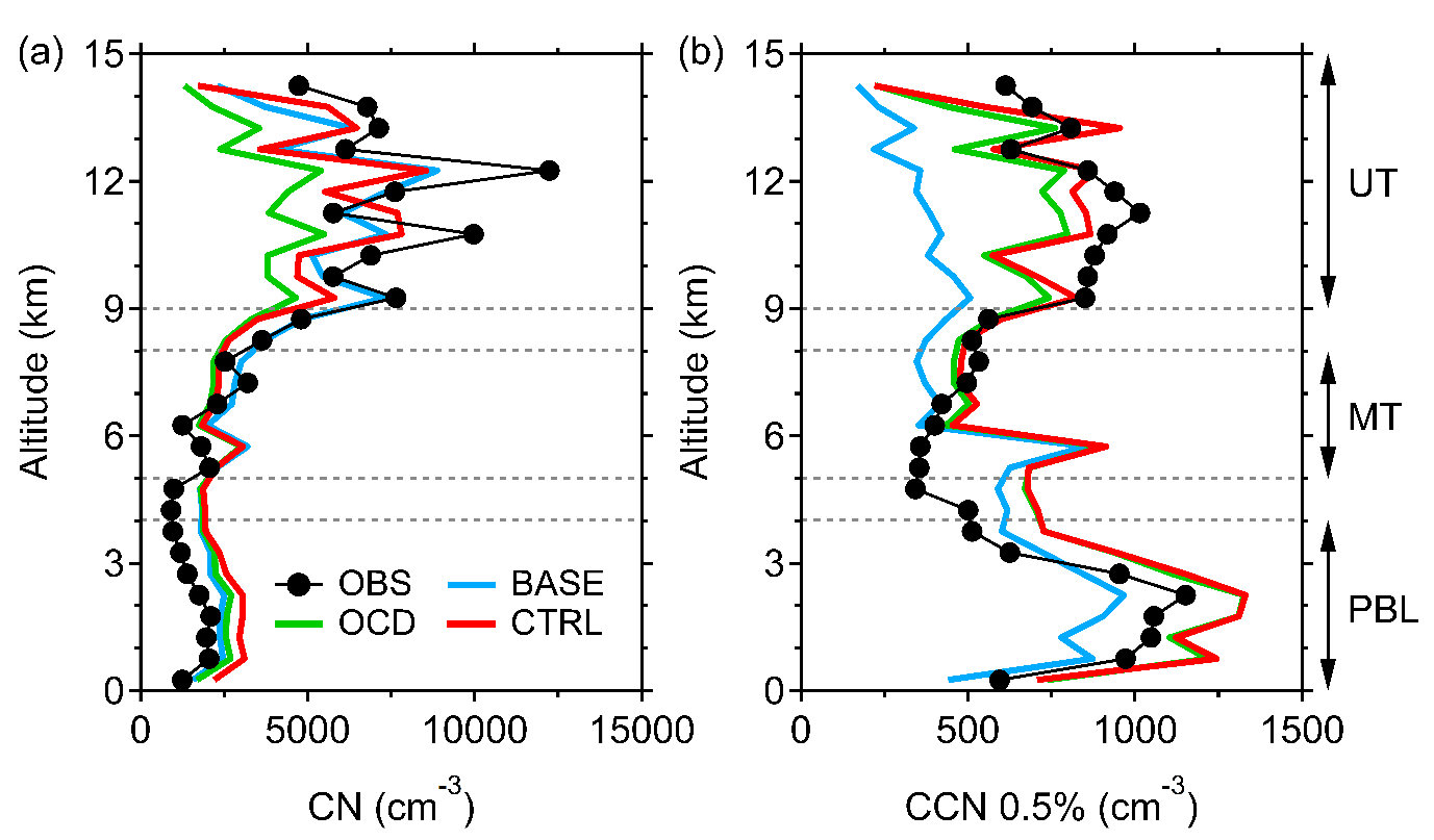 图2. 观测与模拟的总气溶胶粒子数(a)和0.5%过饱和度的云凝结核数(b)。
