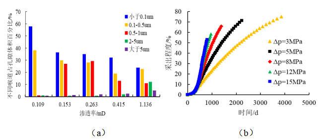 图5 渗流模型的应用(a. 利用渗流模型计算得到不同喉道分布岩样对应的渗透率;b. 不同生产压差时气藏采出程度随时间的变化曲线)