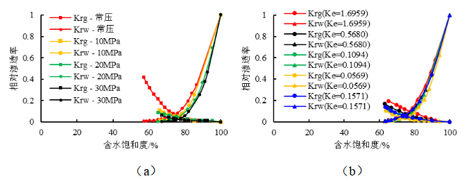 图4 不同孔隙压力和渗透率条件下的气水相对渗透率曲线(a. 不同孔隙压力;b. 不同渗透率)