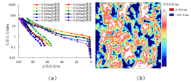 图3 压汞仪和原子力显微镜测试结果(a. 致密砂岩岩样毛管压力曲线;b. 原子力显微镜二维图像)