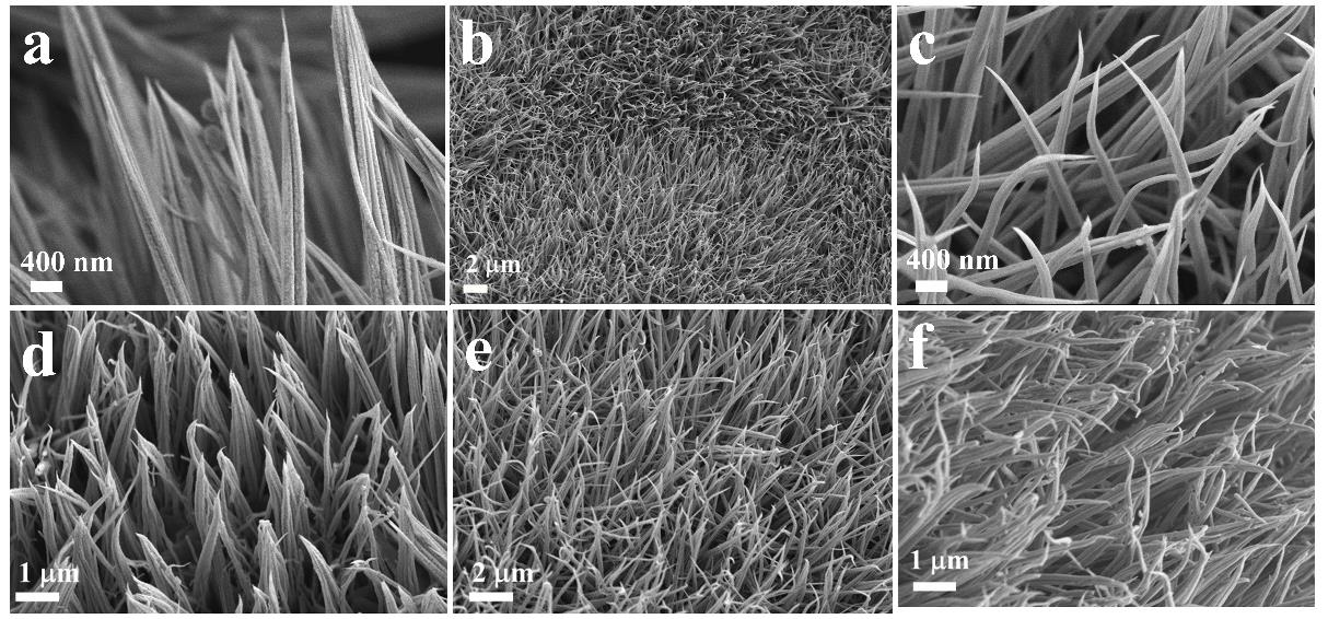 图2(a)Fe-CoP 的SEM图,(b和c)CoOx/Fe-CoP 的SEM图,不同等离子体处理时间下的SEM