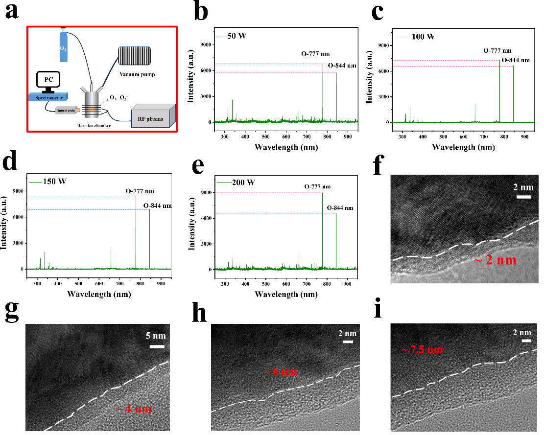 图3(a)OES测试示意图,(b-e)不同功率下O2等离子体的OES图,在不同等离子体辐照时间下纳米线的HRTEM