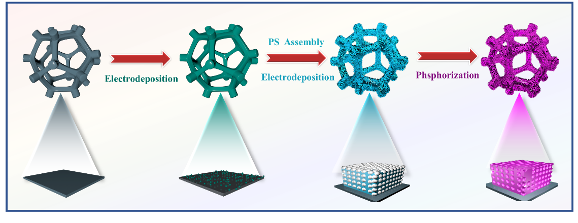 与介孔/微孔结构相比,大孔结构的孔道具有较高的反应物/生成物转移速率,中空的内部空间通常意味着较大的活性面积,这便于电解质向催化剂内部的渗透和扩散,降低内部界面阻力。大多数报道的三维有序大孔材料是在平面衬底上模板制备的,只暴露有限数量的活性位点研究者模板法,研究者们以聚苯乙烯为模板,将其铺设到泡沫镍基体上,随后通过电沉积-低温磷化的方法构筑了三维蜂窝电极(图1)。然而,这些方法合成步骤繁琐,不仅增加了生产成本,而且影响了碳材料电极的实际应用。