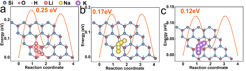 图3(a)Li+、(b)Na+和(c)K+在Weiss-siloxene表面的迁移能垒及相应的迁移路径。