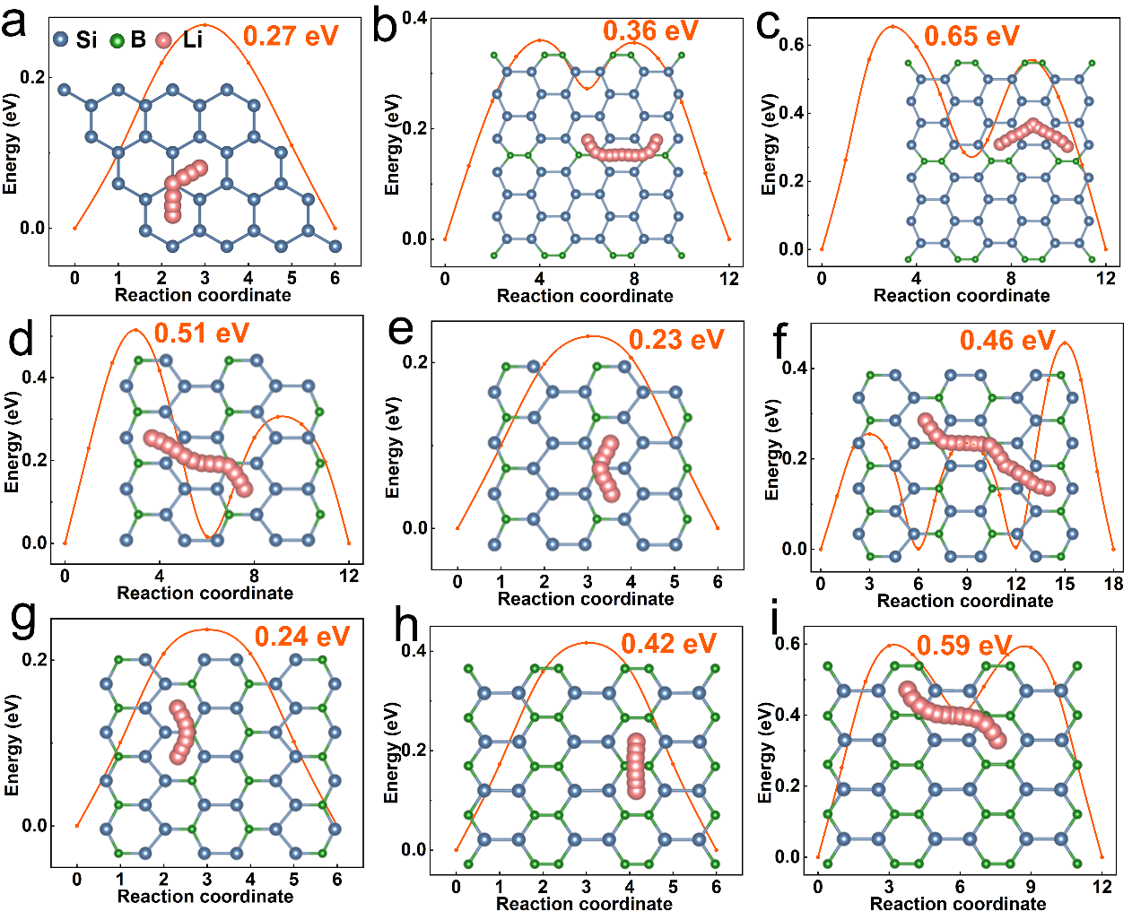 图1 Li+在(a)硅烯、(b, c)BSi4、(d, e)BSi3、(f, g)BSi2 和(h, i)BSi表面上的迁移路径及对应的能垒。
