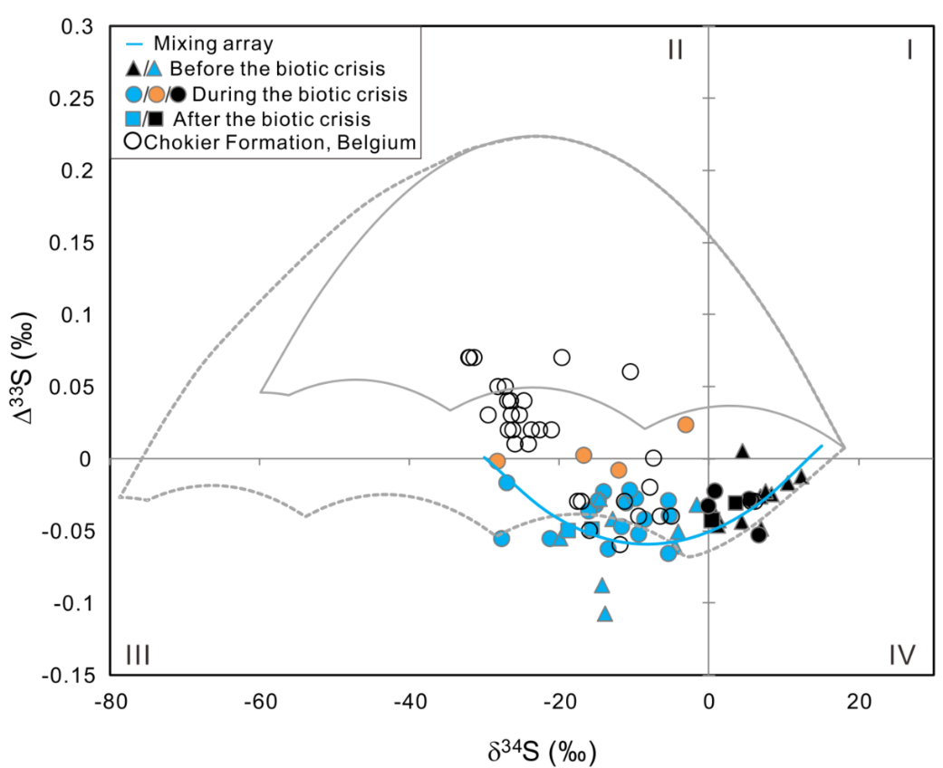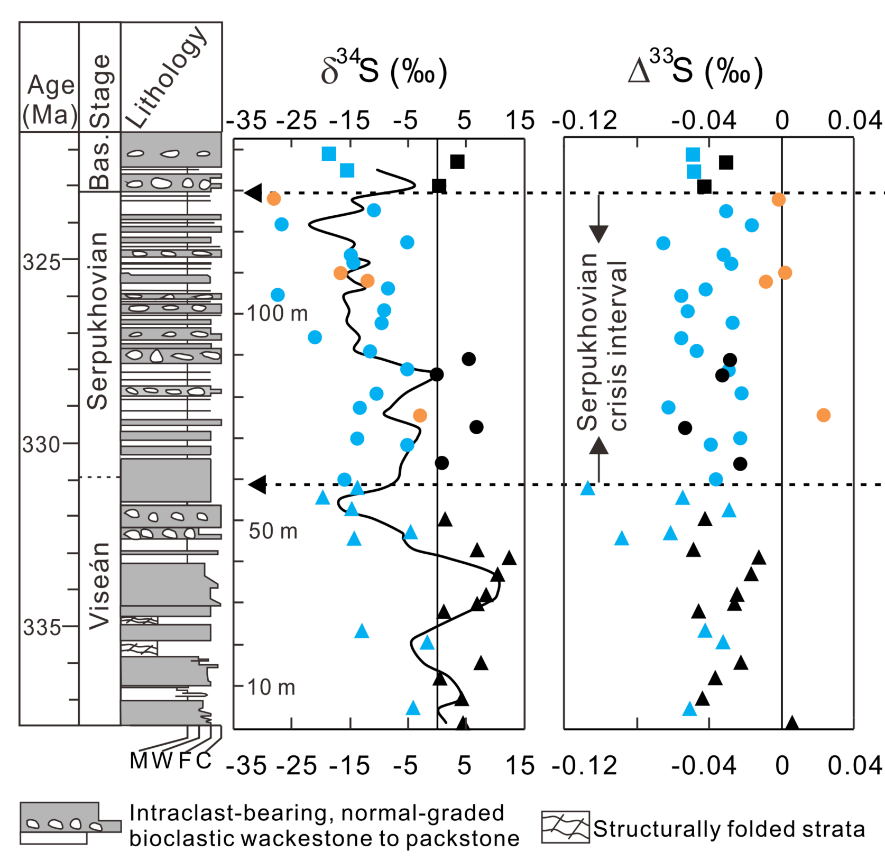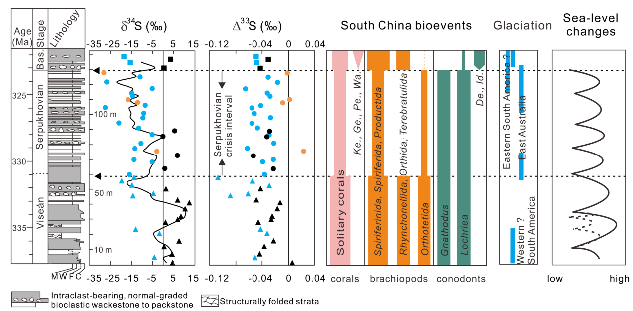 图3. 中石炭纪多硫同位素(d34S-D33S)组成与生命灭绝、冰川演化以及海平面变化的联系。