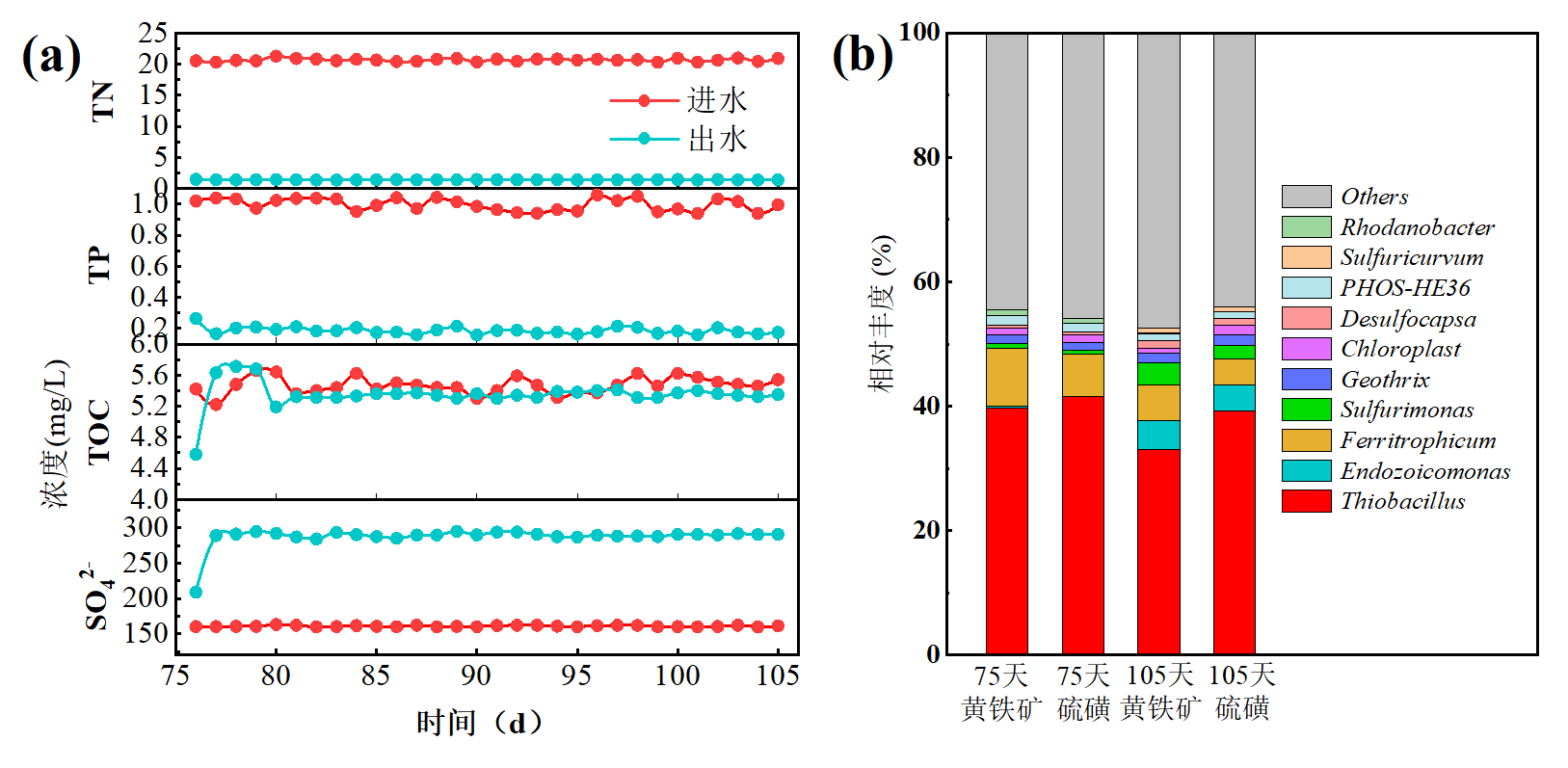 图3 PSAD体系实际废水处理的运行性能(a)和属水平细菌群落(Top 10)(b)