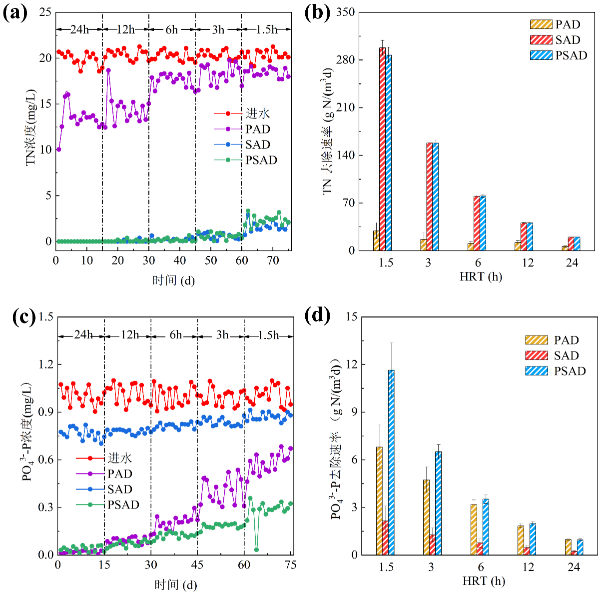 图1 PAD、SAD和PSAD体系的TN TN浓度变化(a)、TN去除速率(b)、PO43--P浓度变化(c)和PO43--P去除速率(d)