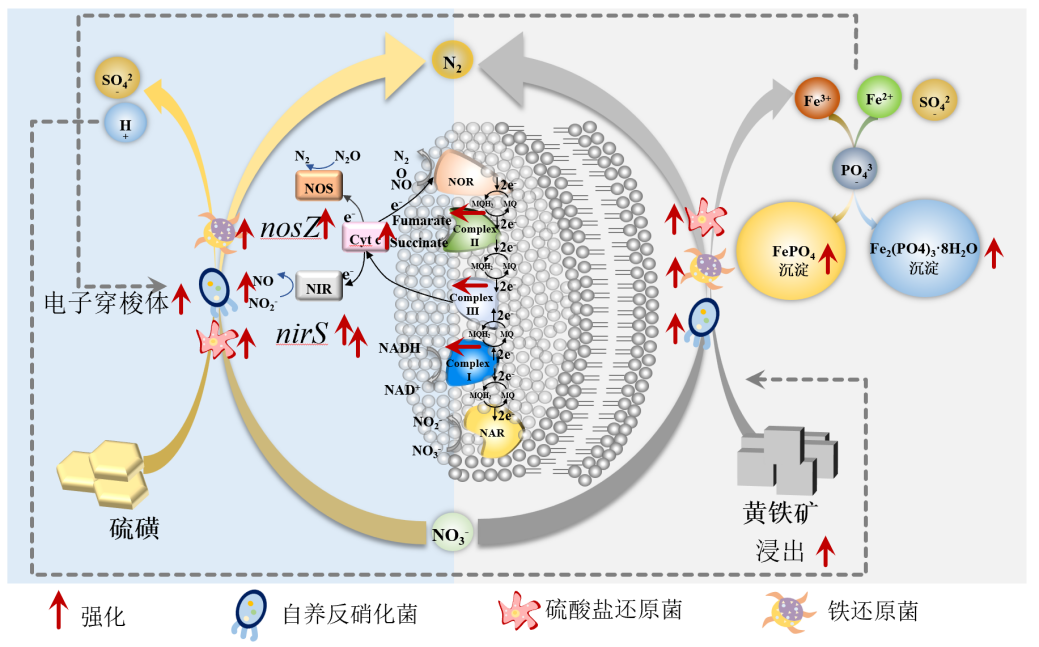 机理分析表明,在PSAD体系中,PAD与SAD的耦合作用不仅促进了硫和铁的转化,同时扩展了反应区域。因此,PSAD体系内生物量得以累积,并增强了微生物反硝化功能的稳定性,包括黄铁矿和硫颗粒表面的电子转移与消耗过程。此外,自养反硝化菌(如Thiobacillus和Ferritrophum)、硫酸盐还原菌(如Desulfocapsa)以及铁还原菌(如Geothrix)作为微生物氮、硫和铁循环的关键贡献者,在PSAD体系中得到了显著富集。同时,该体系还促进了铁离子的浸出,并以Fe3(PO4)2·8H2O和FePO4沉淀的形式有效去除磷。综上所述,PSAD被证实为一种高效的同步脱氮除磷技术,能够高效且环保地满足日益严格的排放标准。PSAD强化氮磷去除的机制如图2所示。