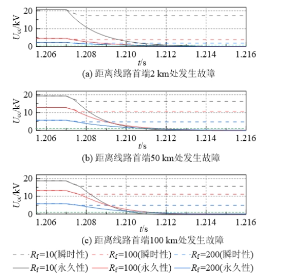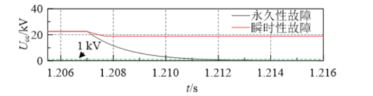 当故障性质为永久性接地故障时,此时的Ucc在5ms后迅速下降至0.79 kV,低于预设电压阈值Ucc0(这里取电压阈值Ucc0为1 kV)。