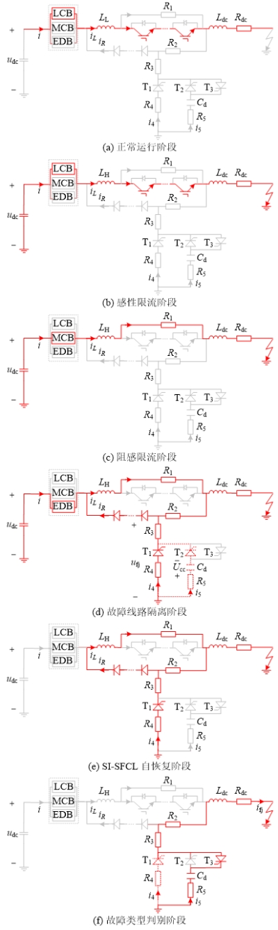直流限流电路与混合式直流断路器(图中以通流支路LCB、转移支路MCB、耗能支路EDB三条并联绘制代替)二者通过配合清除直流故障电流并实现自适应重合闸的过程可分为以下6个阶段,分别是:正常运行阶段、感性限流阶段、阻感限流阶段、故障线路隔离阶段、SI-SFCL自恢复阶段、故障性质判别阶段。