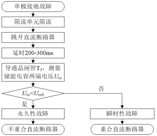 由此,通过检测储能电容Cd两端电压Ucc变化,能够对直流单极接地故障性质进行判别:若Ucc保持Uccmax不变,则故障性质判别为瞬时性接地故障;若在给晶闸管T3施加导通信号后,Uccmax快速下降至零,那么判别为永久性接地故障。这里,为提高判别的准确性,可设置一个较小的电压阈值Ucc0取代零,即Ucc<Ucc0时,判定接地故障为永久性接地故障,否则为瞬时性接地故障。