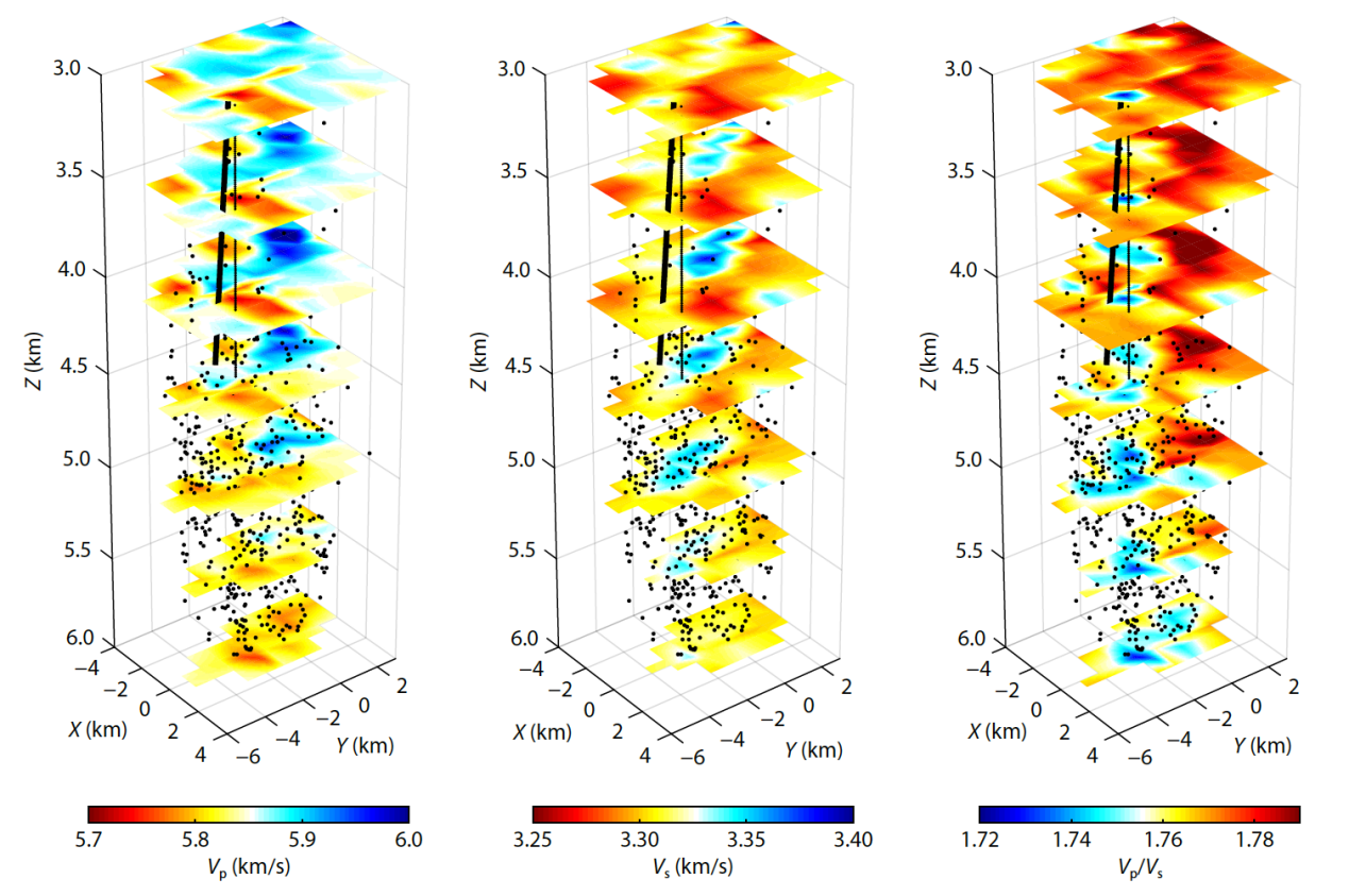图1韩国浦项地区深度范围为3至6公里的Vp、Vs和Vp/Vs模型。黑线表示地热井轨迹,黑点表示地震。