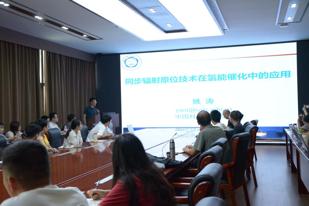姚涛介绍了氢能的发展现状和未来前景,并围绕氢能领域涉及的催化反应,提出了如何捕捉能源材料在工作和服役环境下的若干关键中间体并揭示其结构动态变化过程,是理性设计和制备高效能源存储和转换材料的基础和前提。报告会上,姚涛重点介绍了团队多年来基于同步辐射大科学装置,发展的一系列原位X射线吸收谱和红外谱学技术,在原子级水平精确鉴别功能材料在实际工作状态下的真实结构及动态演化过程、从原子尺度揭示了在复杂反应环境中电催化剂表面活性位点吸附反应分子的原子构型和电子结构及中间态构型等领域取得的系列研究成果。
