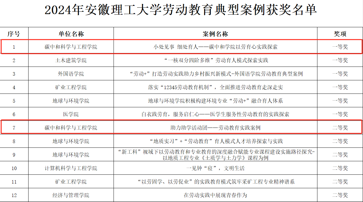 近日,安徽理工大学公布了2024年劳动教育典型案例评选结果,碳中和学院成绩斐然。