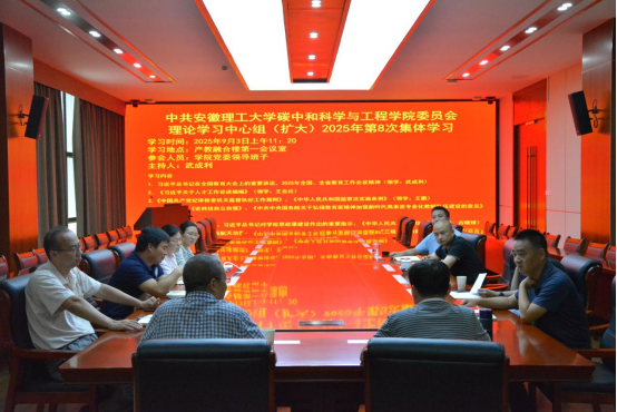 9月3日上午,中共安徽理工大学碳中和科学与工程学院委员会理论学习中心组(扩大)在产教融合楼一楼会议室举行2025年第8次集体学习,会议由院党委书记武成利主持,学院党委领导班子全体成员等参加。