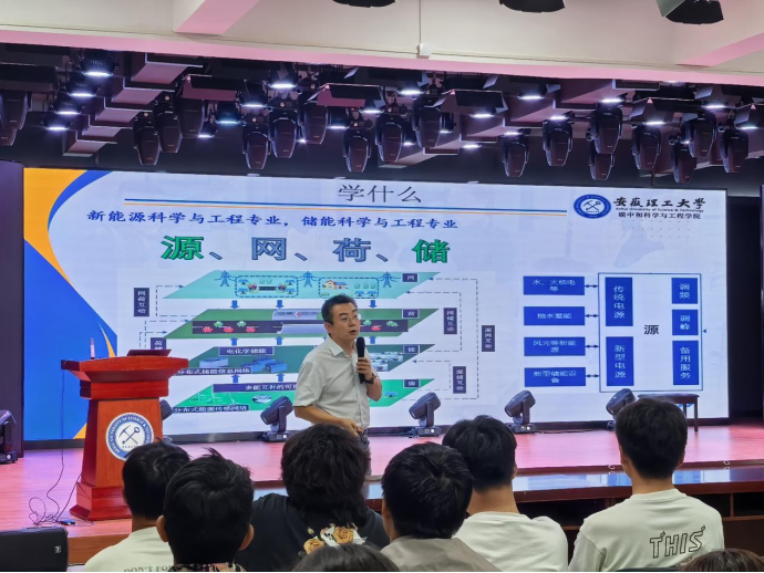 讲座中,孙鹏梳理了学院发展脉络,强调学院立足国家“双碳”战略、服务安徽区域产业发展的定位。随后聚焦专业解析,结合产业需求阐明专业核心价值:储能科学与工程专业作为国家紧缺人才培养重点专业,聚焦化学储能等关键领域,依托学校化学工程等优势学科,培养解决产业发展难点痛点的技术人才;新能源科学与工程专业以氢能、光伏为核心,构建多学科交叉体系,匹配安徽重点产业方向。他指出,学院拥有优秀的专任教师团队,承担数额可观的科研项目,积极搭建特色专业实验平台,为学生提供从理论到实践的全链条培养支撑。