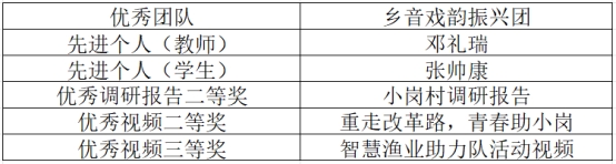 在本次评优中,学院的“乡音戏韵振兴团”被评为优秀团队。学院团委副书记邓礼瑞获得先进个人(教师)称号,学生张帅康获得先进个人(学生)称号。此外,学院的《小岗村调研报告》获得优秀调研报告二等奖,《重走改革路,青春助小岗》获得优秀视频二等奖,《智慧渔业助力队活动视频》获得优秀视频三等奖。