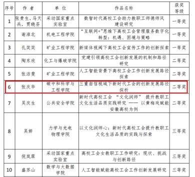 近日,安徽理工大学工会委员会公布2025年工会教代会理论研究论文评选结果,碳中和科学与工程学院教师张庆华撰写的论文《三重自信视域下新时代工会的创新发展路径探析》凭借鲜明的时代视角、扎实的理论功底和务实的实践价值,荣获二等奖。