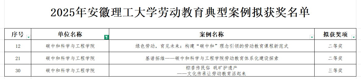 近日,2025年安徽理工大学劳动教育典型案例获奖名单正式公布,经个人申报、学院推荐、学校组织专家评审等严格流程,全校共51件案例脱颖而出,其中劳动教育课程建设与教学研究类6件,日常生活劳动类1件,生产劳动类8件,服务性劳动类26件,文化传承劳动类10件。碳中和科学与工程学院教师凭借高质量的劳动教育实践案例,成功斩获多项荣誉,充分彰显了学院在劳动育人领域的扎实基础与创新能力。
